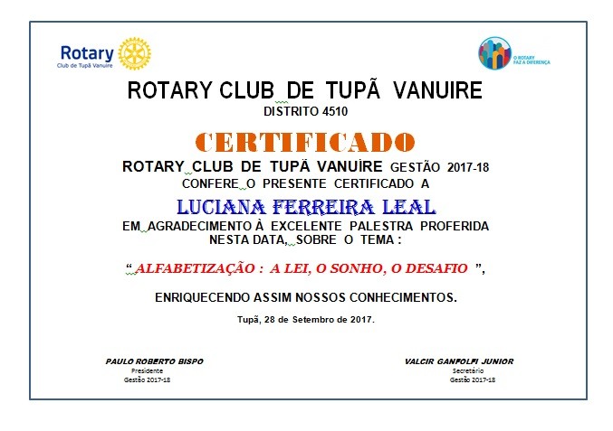 Com enorme satisfação o Rotary Club de Tupã-Vanuire recebeu em sua reunião, dia 28/09/2017, a presença da Pós-Doutora em Letras Luciana Ferreira Leal que proferiu palestra sobre o tema "Alfabetização", enriquecendo o conhecimento dos rotarianos deste clube. Agradecemos de forma calorosa a aceitação de nosso convite, bem como agradecemos a FACCAT - Faculdade de Ciências Contábeis e Administração de Tupã, que disponibilizou essa brilhante profissional, em horário de trabalho, para que este Rotary Club pudesse contar com seus conhecimentos.